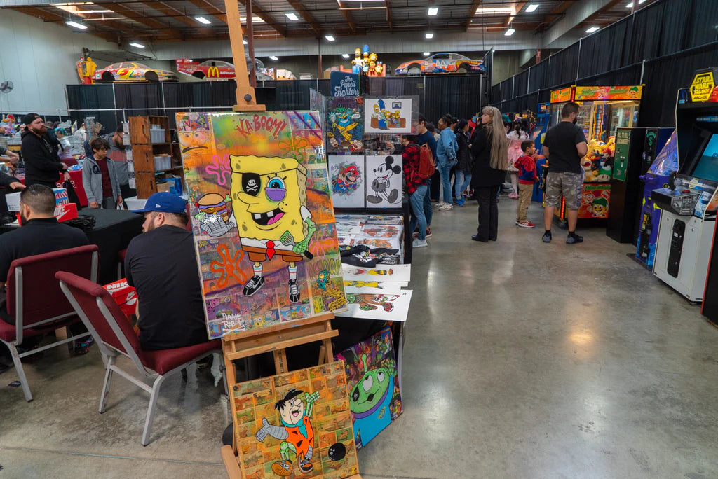 The first Enamel Market started out with sixteen artists in the parking lot of 3Dretro, a toy store in Glendale full of collectibles and limited edition toys. Now growing to forty artists, the exhibition hall at Frank & Son’s was the perfect place to host the event. Surrounded by retro arcade games, the area was buzzing with activity as people would take breaks from walking the show and partake in more nostalgia with their favorite arcade games.