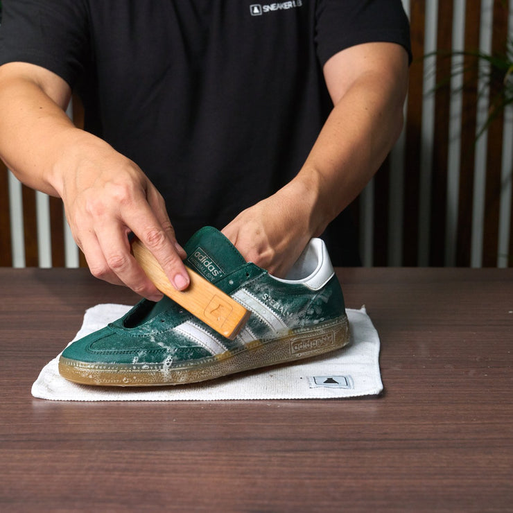 Step 2: Next, apply our Sneaker Cleaner solution over the entire surface of the sneakers. Dip our Premium Brush into a container of water and begin scrubbing the suede upper in a circular motion until a foamy lather forms, be mindful of excess water over-saturating these suede sections. Proceed to clean the gum rubber outsole of the sneaker, ensuring to scrub until all dirt is lifted from the surface.