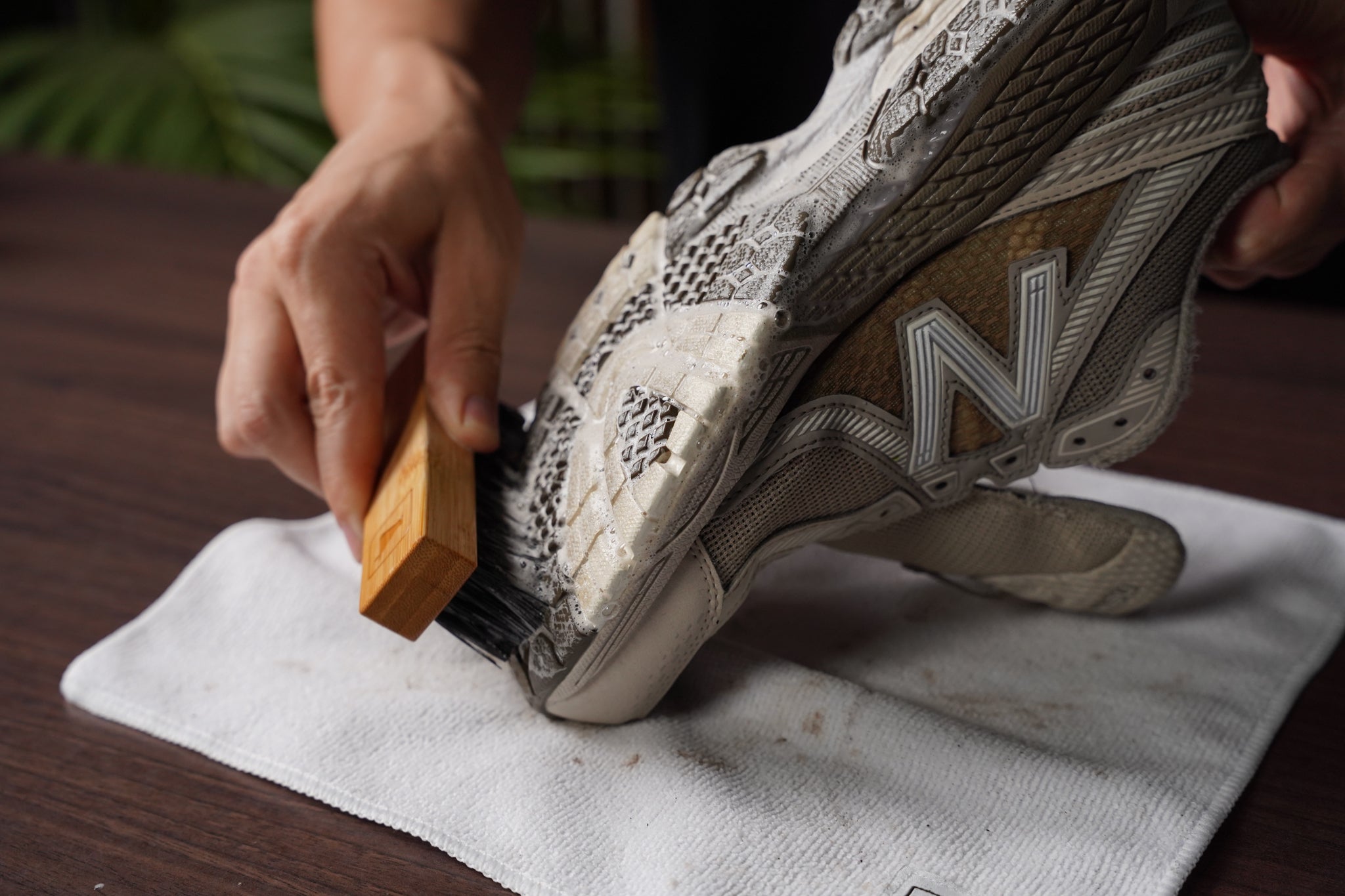 Step 2: Spray our Sneaker Cleaner around the sneakers. Grab our Premium Brush and dip the brush into a container of water. Start scrubbing the upper which is made up of breathable mesh material, in a circular motion until foam appears. Move onto cleaning the reflective accent pieces of the sneaker and continue cleaning until dirt is completely removed from the surface of the sneaker.
