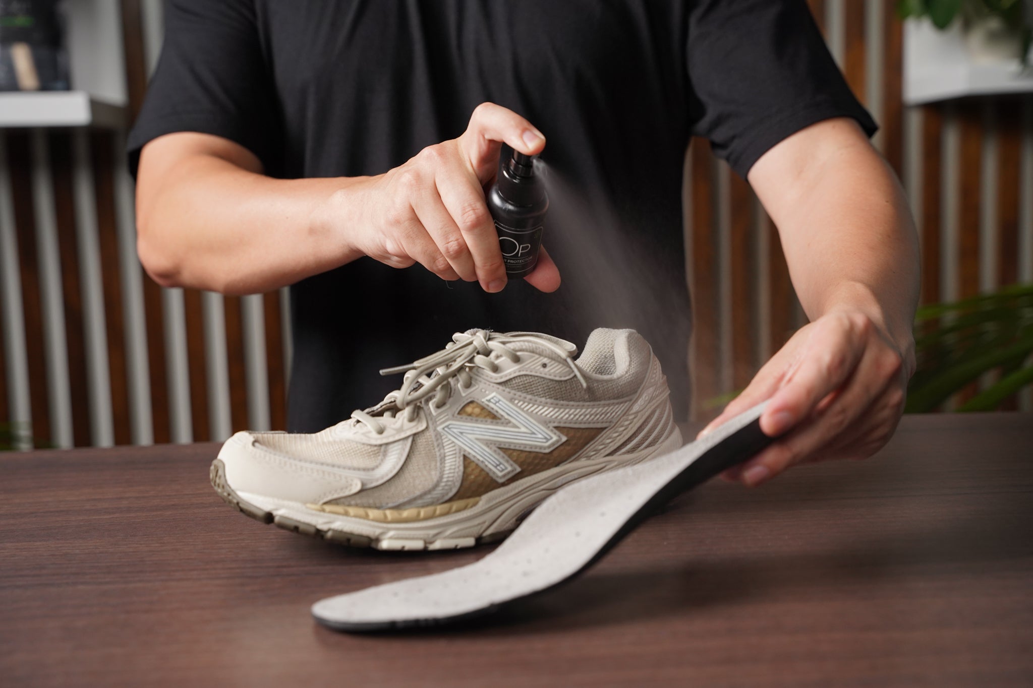 Step 6: Next, we will add our Protective Sprays. Firstly, use our Odor Protector within the soles of the sneaker to remove unwanted odors and prevent bacteria from building up. If the inner soles are removable, take them out and spray the inside of the sneaker and the inner soles.