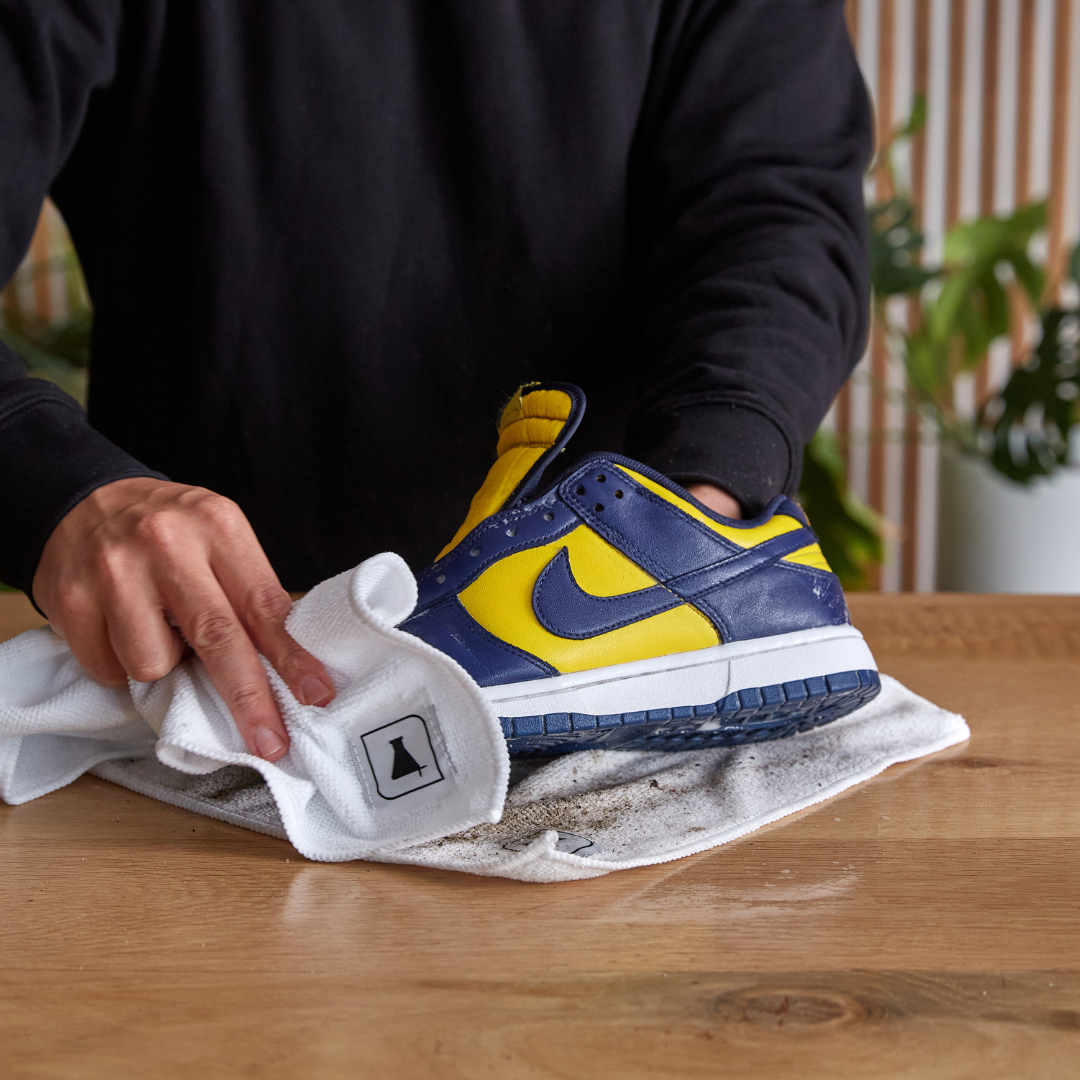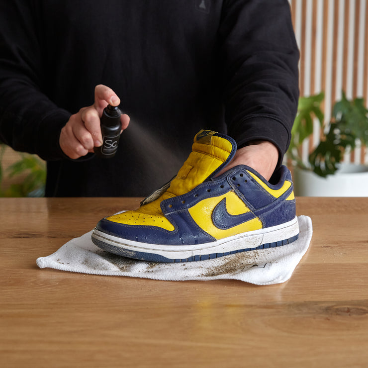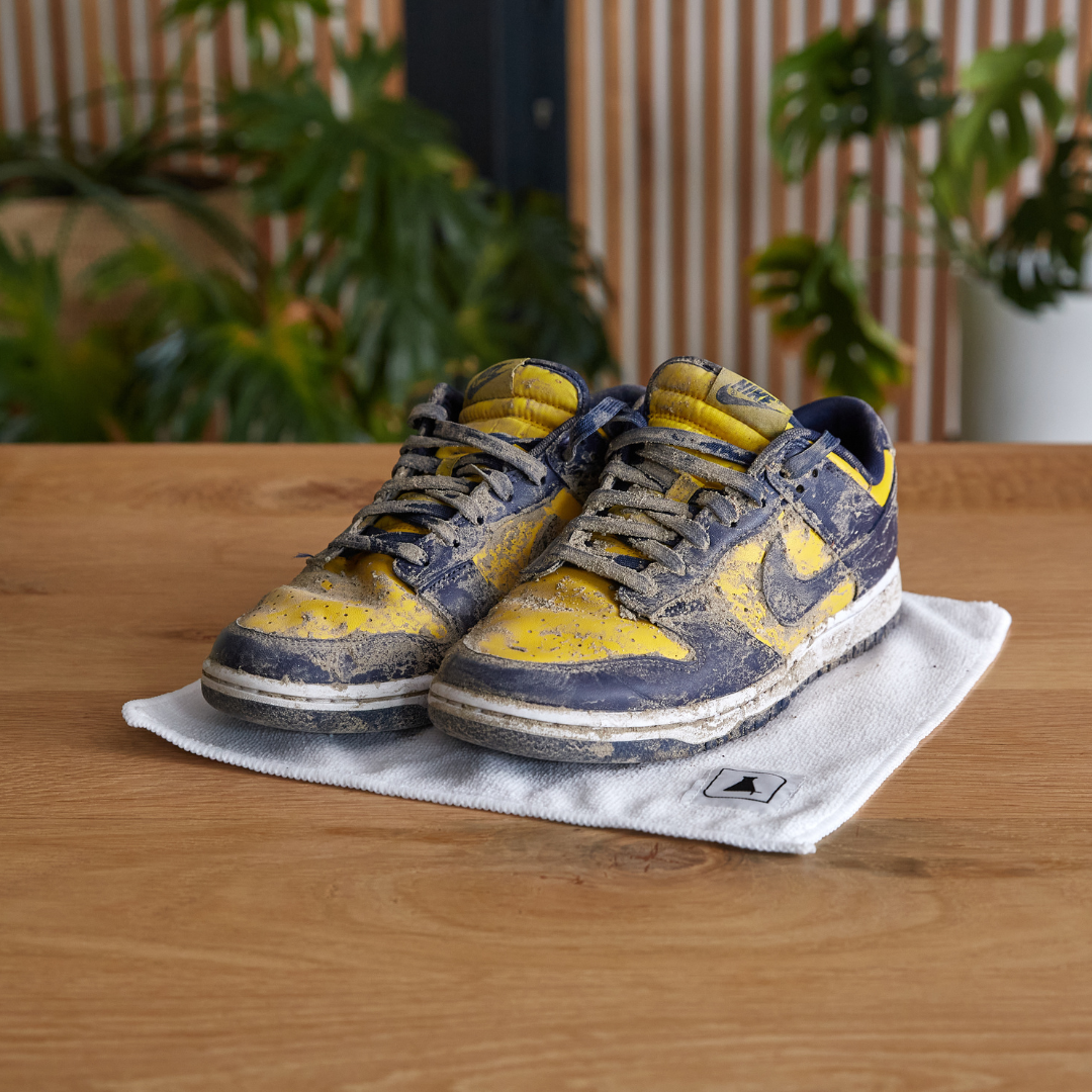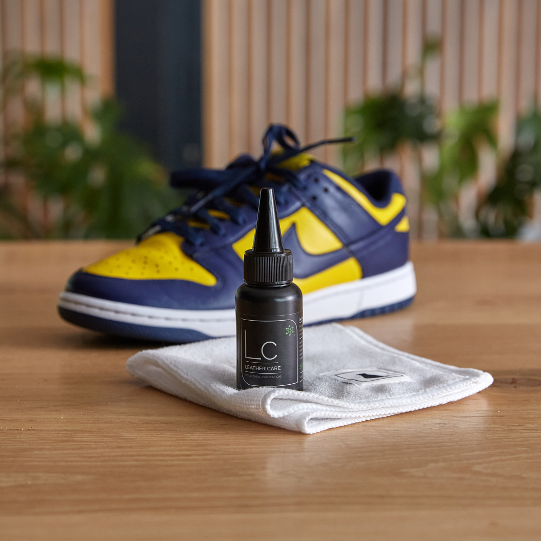 Today we will be cleaning the Nike Dunk Michigan and the products used can be found in our Premium Kit along with our Leather Care. The Premium Kit consists of our Sneaker Cleaner, Sneaker Protector, Odor Protector and Premium Brush.