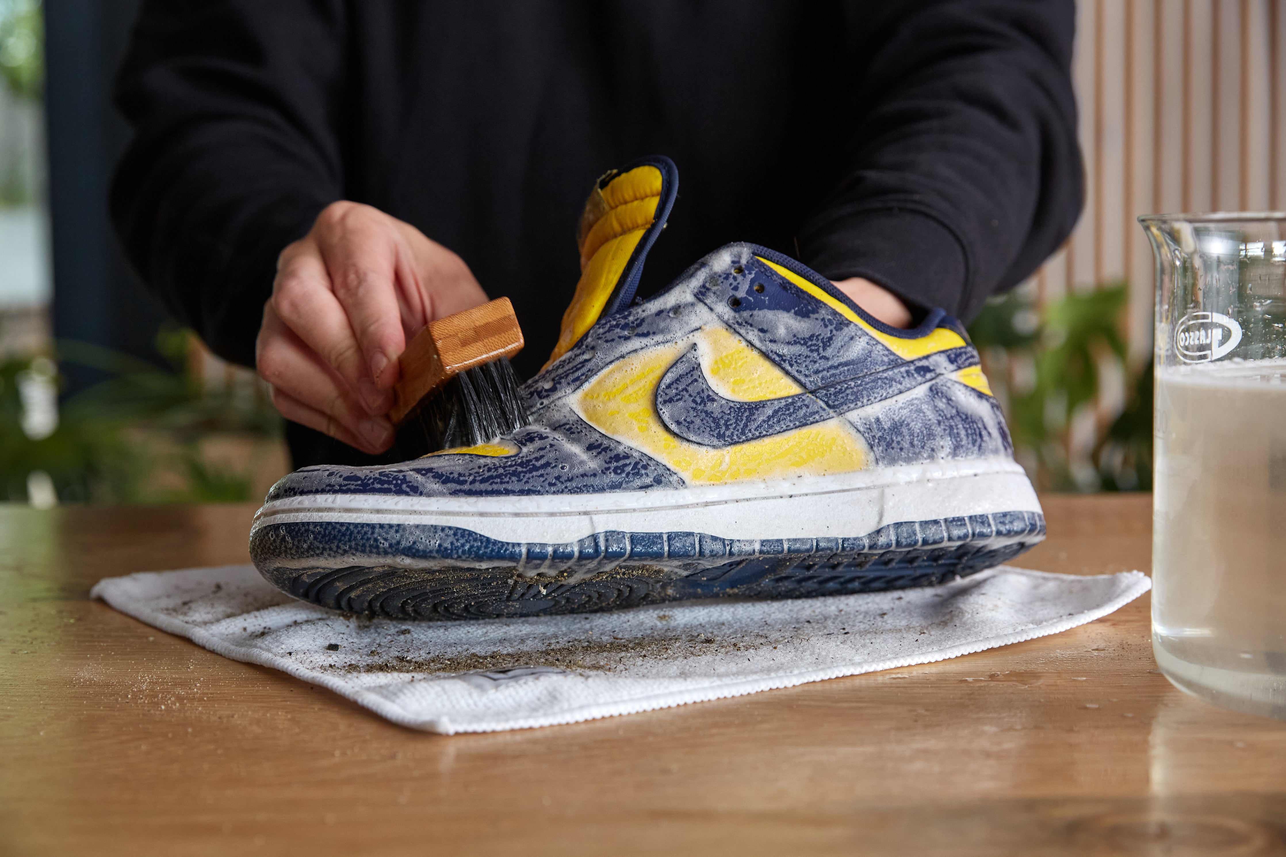 Prepare your Dunks for a deep clean by removing the laces of the sneakers and set them aside. Then grab our Premium Brush and dry brush off any excess dirt that is on the surface of the sneaker. This will make the cleaning process a whole lot easier.