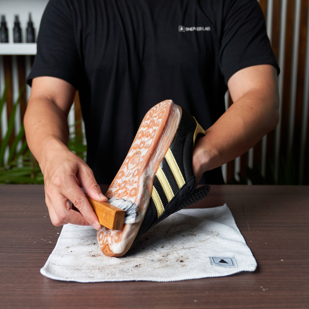 Next, evenly apply our Sneaker Cleaner solution over the entire surface of the sneakers. Submerge our Premium Brush into a container of water and begin scrubbing the nylon upper in a circular motion until a foamy lather forms. Proceed to clean the outsole of the sneaker, ensuring to scrub until all dirt is lifted from the surface.
