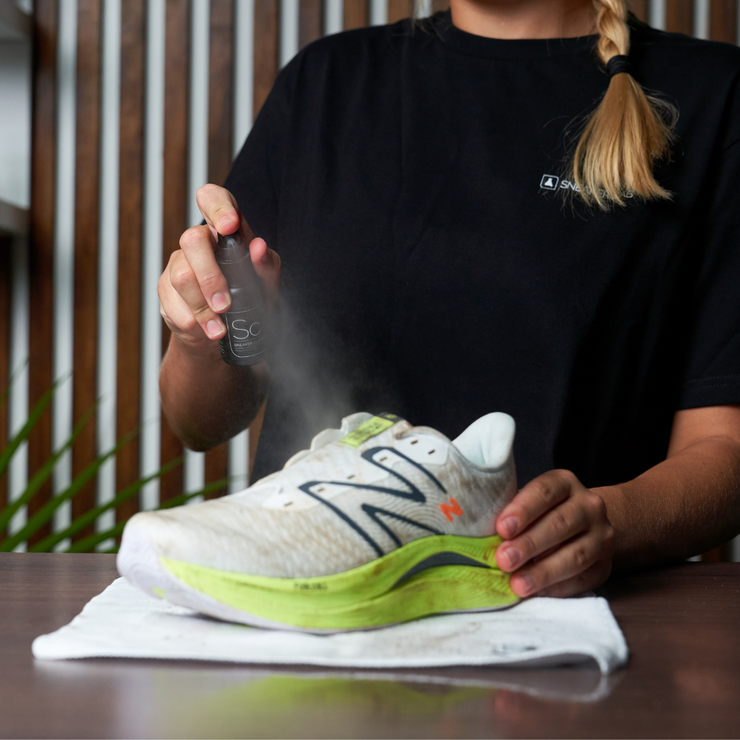 Step 6: Apply our Odor Protector within the soles of your FuelCells to effectively eliminate unpleasant odors and hinder the growth of bacteria. Take out the insoles and generously spray both the interior of the shoes and the insoles themselves.