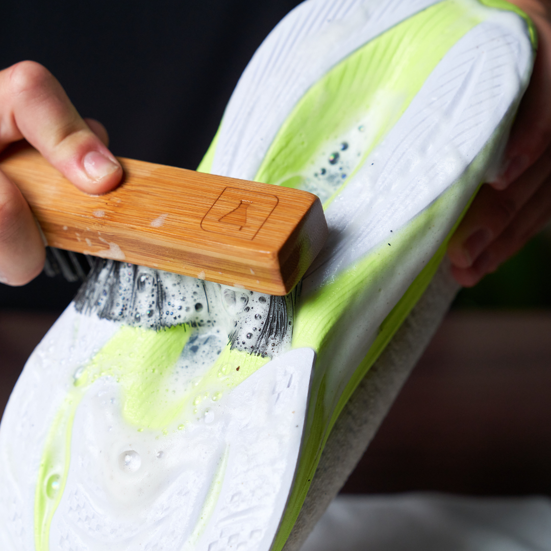 Step 2: Next, evenly apply our Sneaker Cleaner solution over the surface of the shoes. Submerge our Premium Brush into a container of water and begin scrubbing the mesh upper in a circular motion until a foamy lather forms. Proceed to clean the outsole of the shoes, ensuring to scrub until all dirt is lifted from the surface.