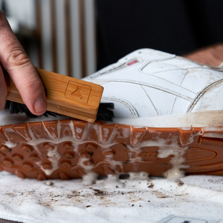 Step 2: Next, apply our Sneaker Cleaner solution over the entire surface of the sneakers. Dip our Premium Brush into a container of water and begin scrubbing the mesh upper in a circular motion until a foamy lather forms. Proceed to clean the outsole of the sneaker, ensuring to scrub until all dirt is lifted from the surface.