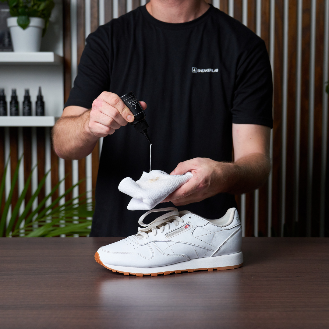 Step 8: Complete the cleaning process by applying our Leather Care solution to the leather outsole using a clean Microfiber towel. This treatment nourishes and safeguards, resulting in a fresh and polished appearance. Additionally, the conditioner shields your Reeboks from harmful UV rays and establishes a water-resistant barrier for added protection.