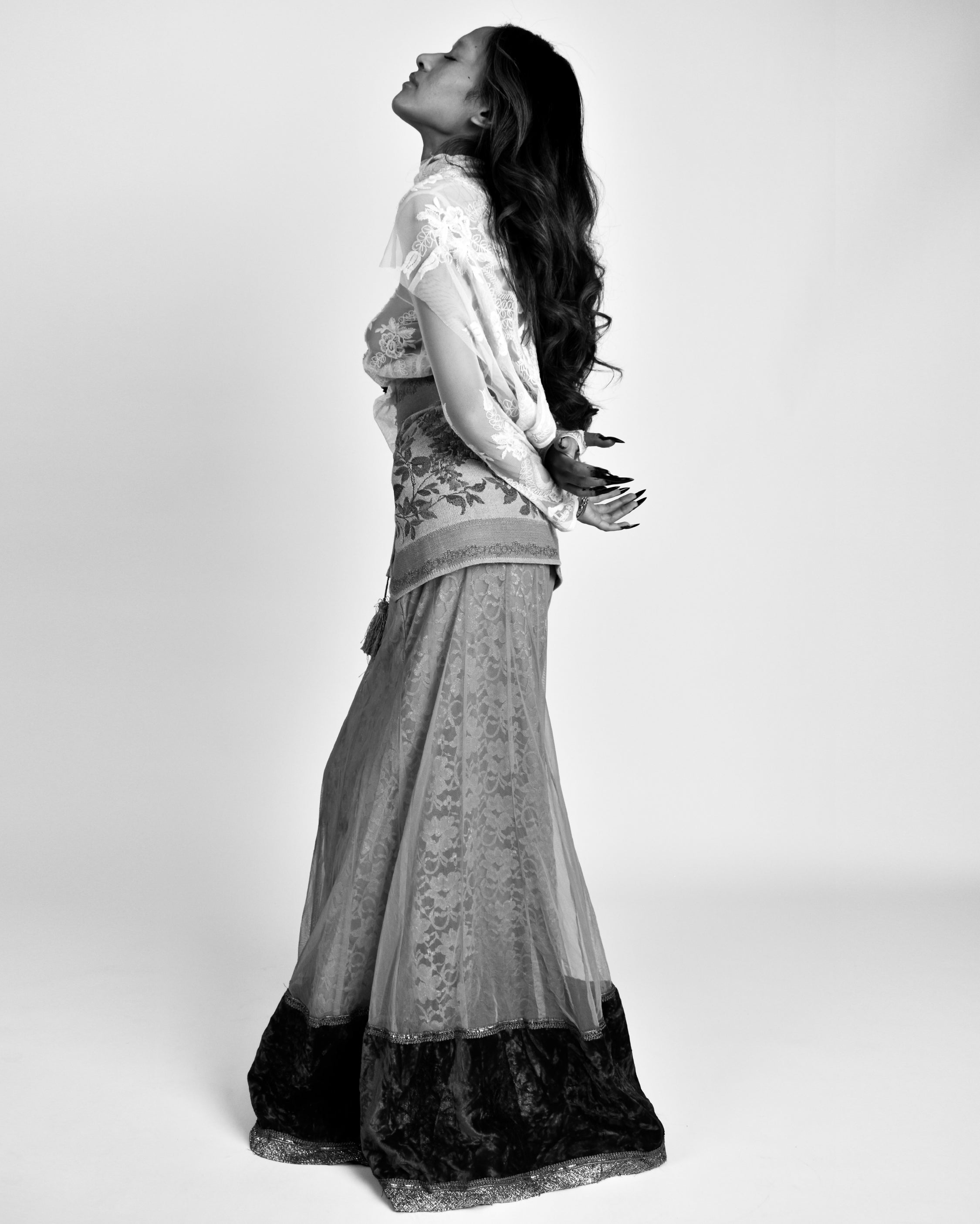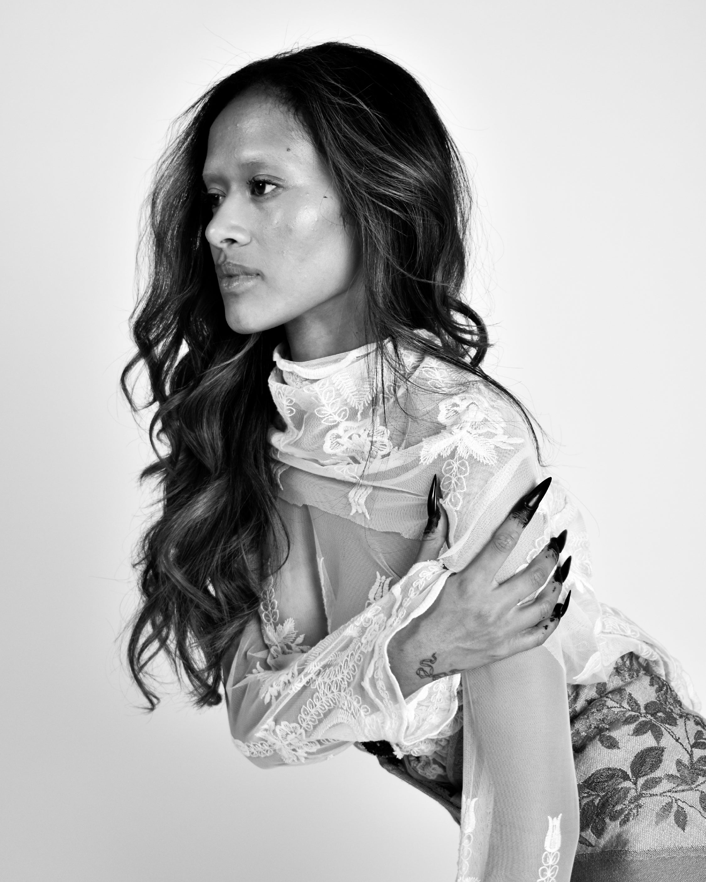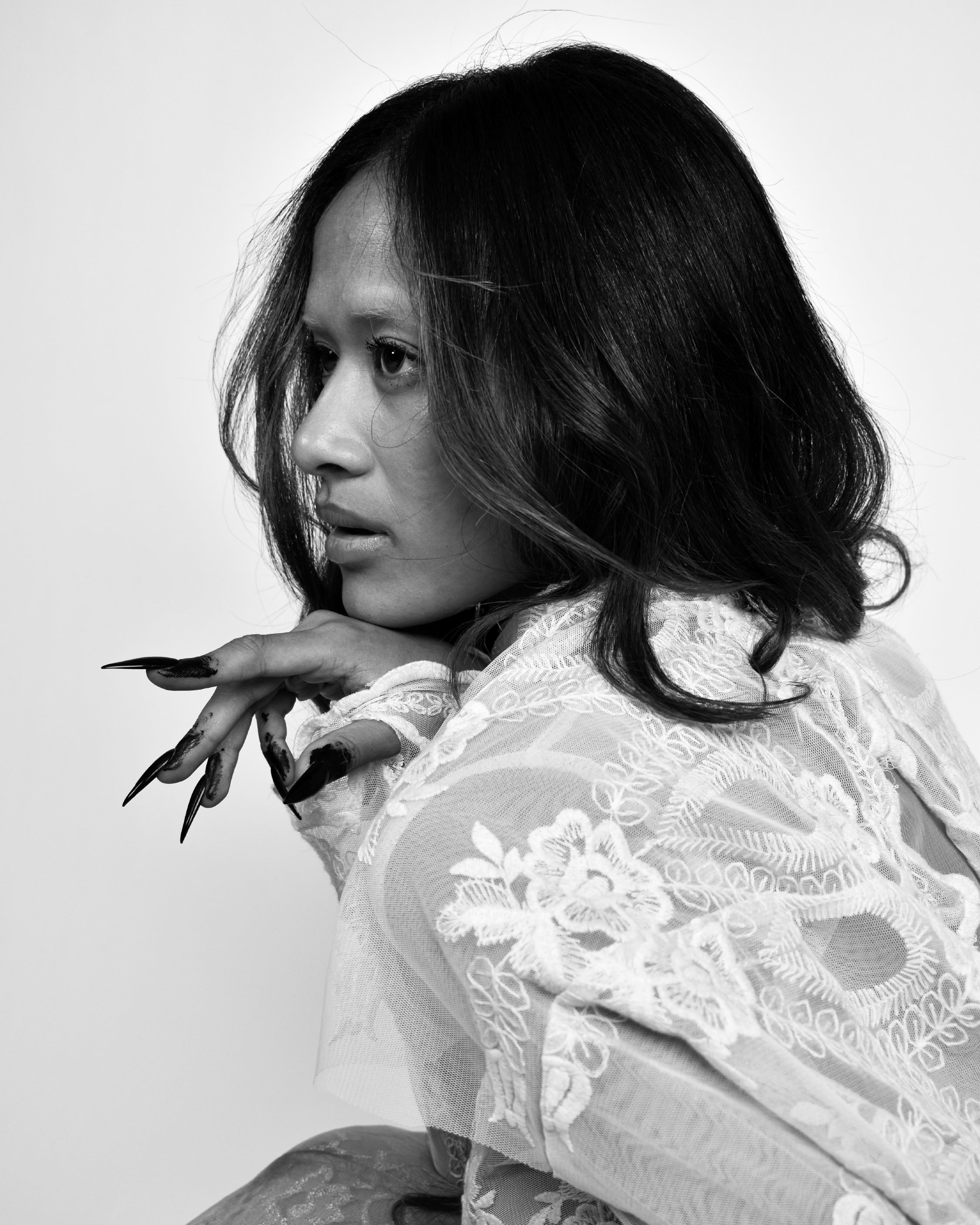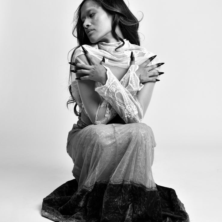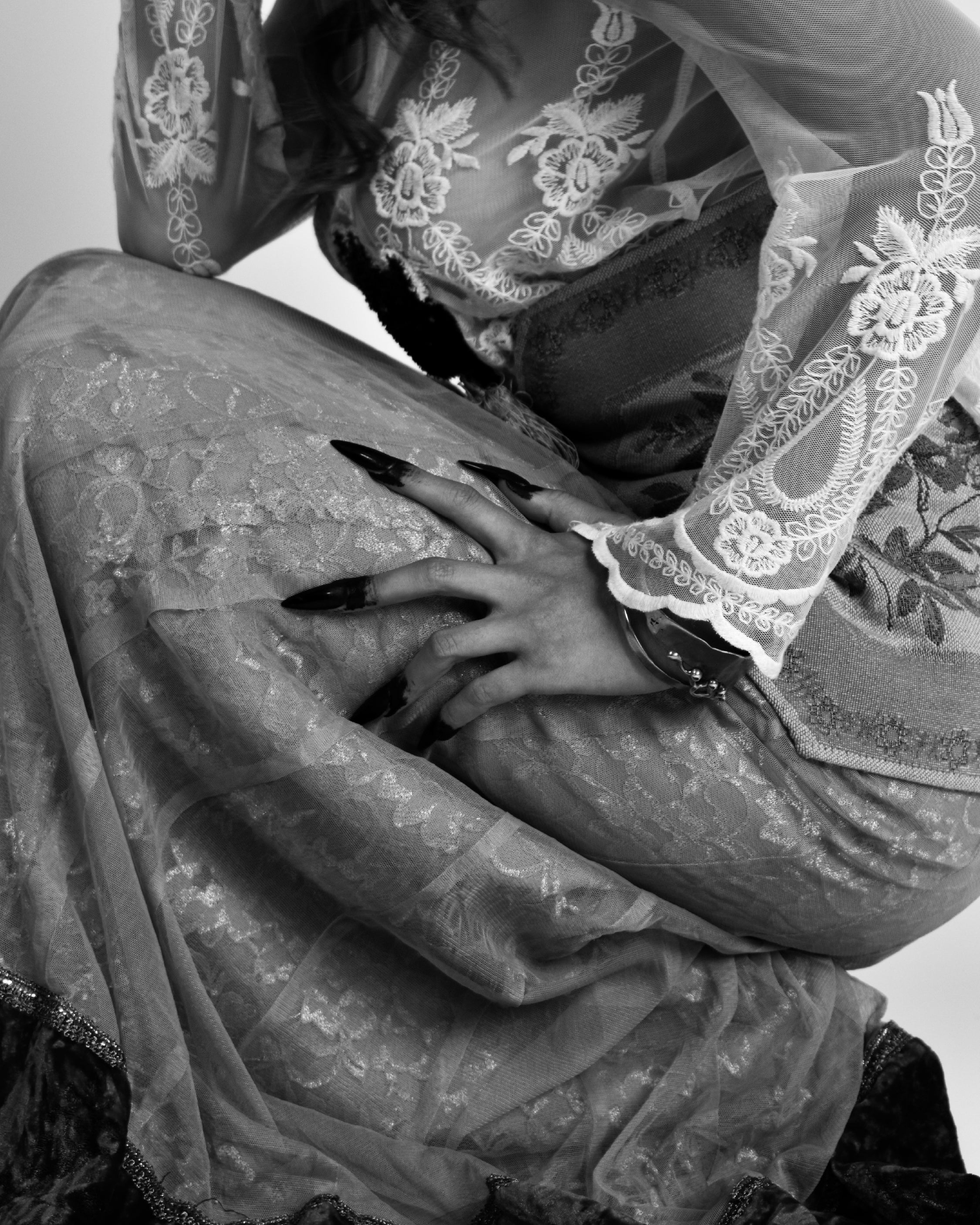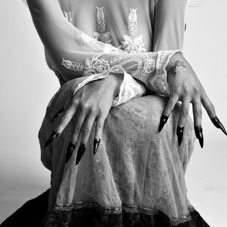 “My dark, black-stained nails symbolise the tools I’ve been given to dig deep—helping to create spaces where truths can exist freely and heal what was once taken from me.”
