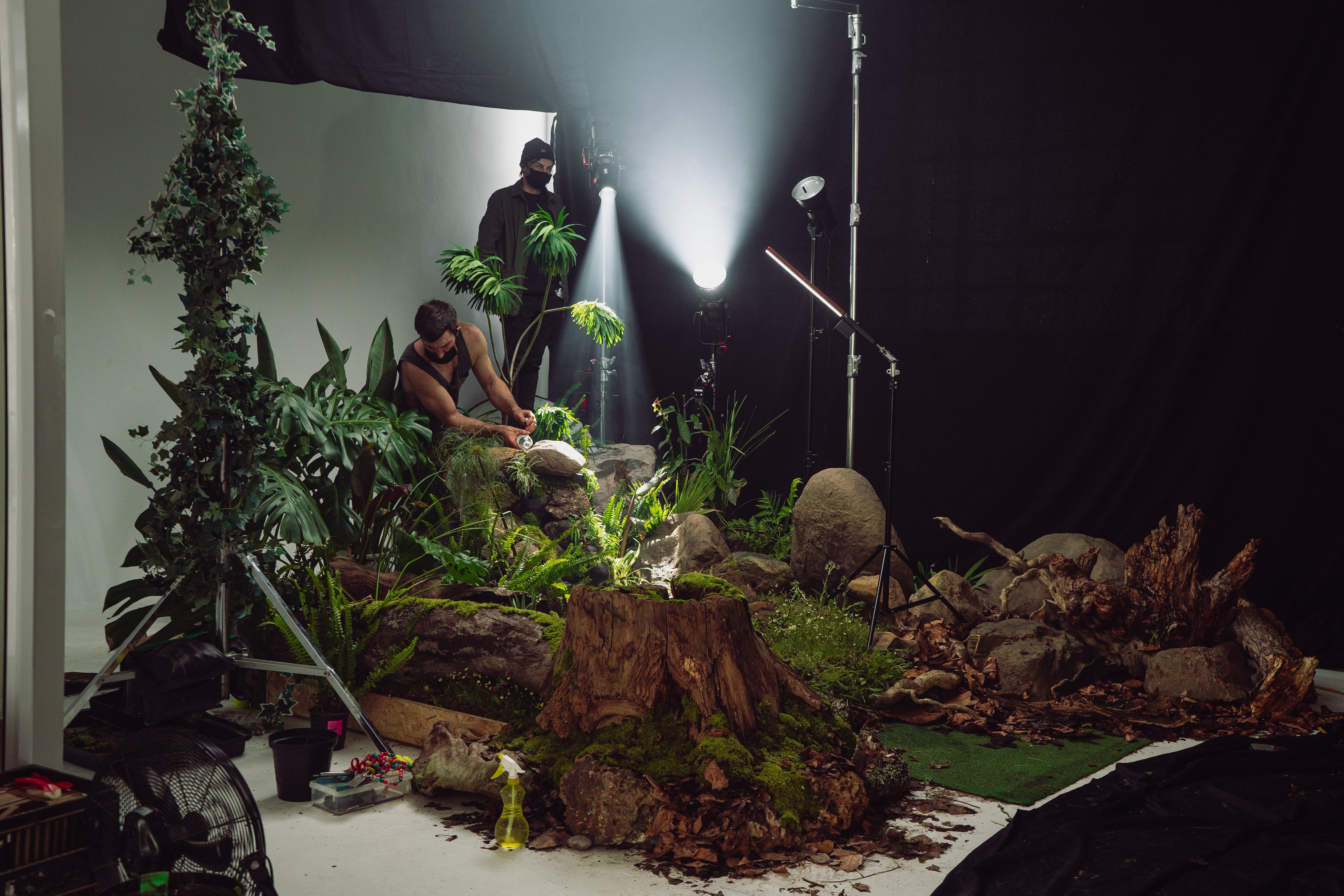 The set that was created for this shoot consisted of local plants and greenery that was sourced from Hout Bay, Cape Town. The set was built up on the day of shooting and we made sure that no damage occurred to the greenery. After the set everything that was used was planted back into its natural habitat, meaning that those plants' lifecycle could continue. We wanted to combine nature into a studio to capture the essence of our brand, playing with the blend between our environmentally conscious pillar but still communicating our place in the world of streetwear.